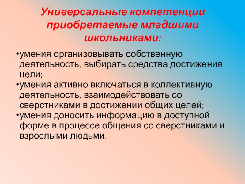 Слайд 6Универсальные компетенции приобретаемые младшими школьниками: