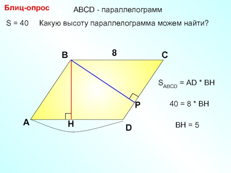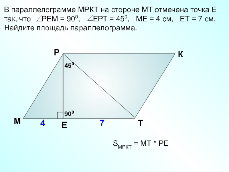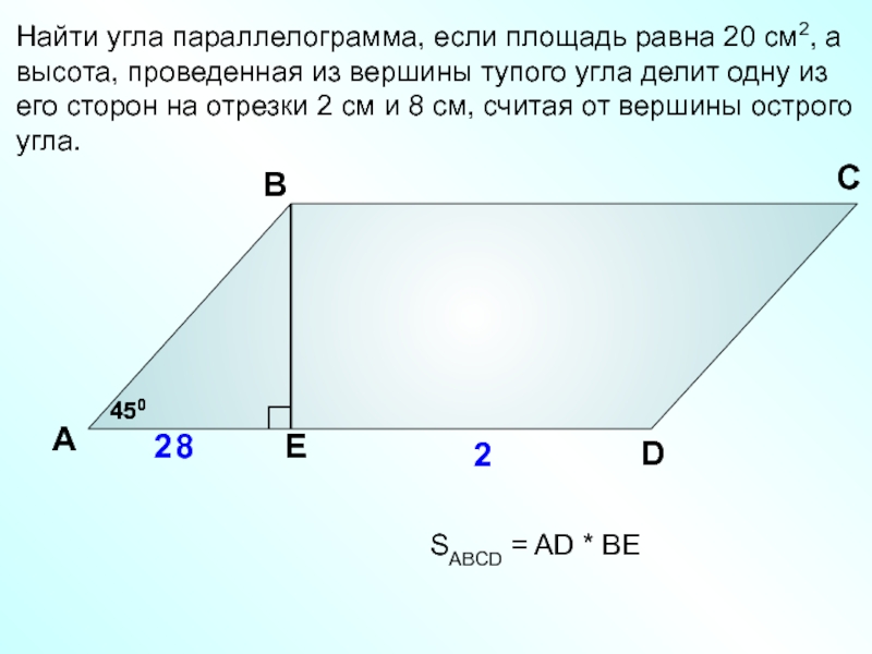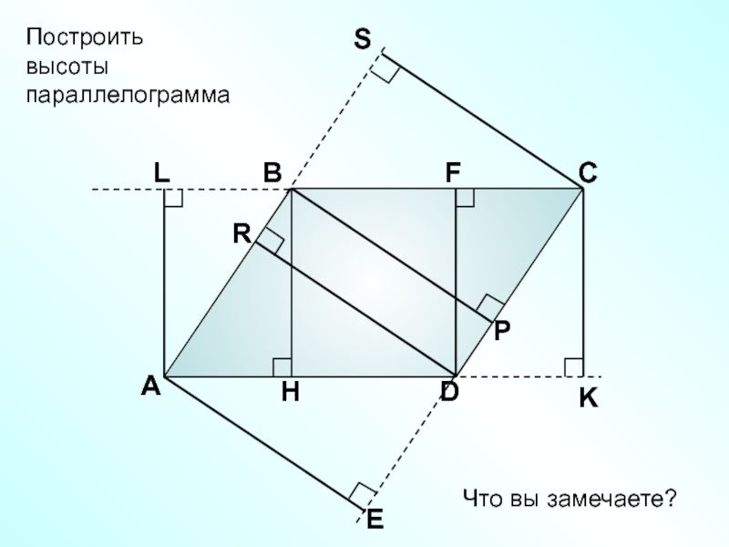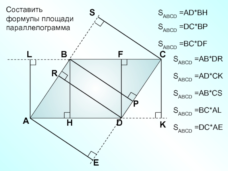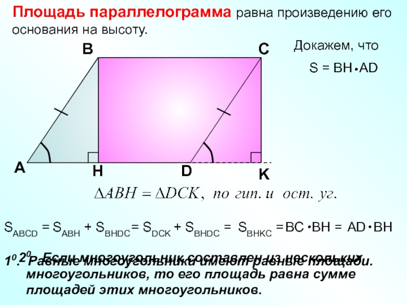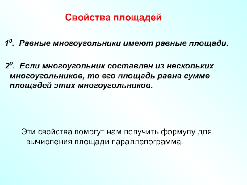 Эти свойства помогут нам получить формулу для вычисления площади параллелограмма.