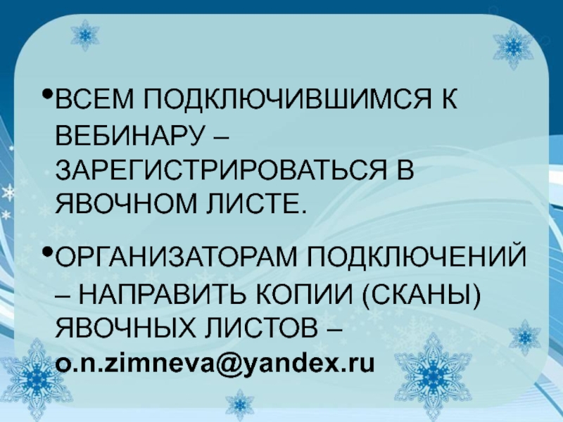 Слайд 36ВСЕМ ПОДКЛЮЧИВШИМСЯ К ВЕБИНАРУ – ЗАРЕГИСТРИРОВАТЬСЯ В ЯВОЧНОМ ЛИСТЕ.