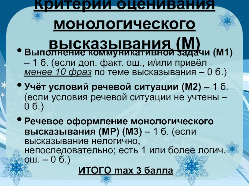 Речевое оформление монологического высказывания (МР) (М3) – 1 б. (если высказывание нелогично, непоследовательно; есть 1 или более логич. ош. – 0 б.)
