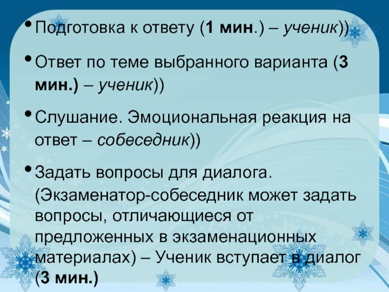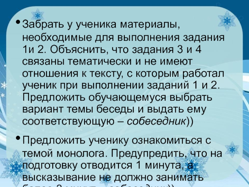 Предложить ученику ознакомиться с темой монолога. Предупредить, что на подготовку отводится 1 минута, а высказывание не должно занимать более 3 минут – собеседник))