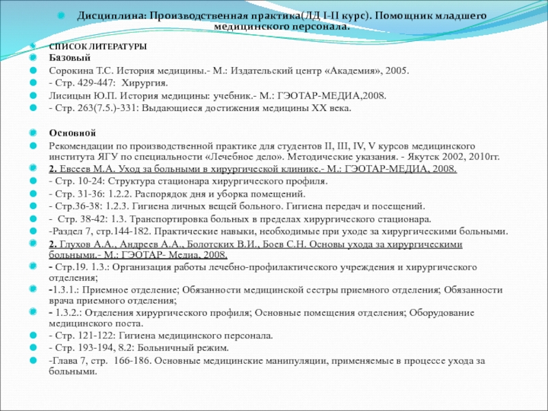 Слайд 16Дисциплина: Производственная практика(ЛД I-II курс). Помощник младшего медицинского персонала.