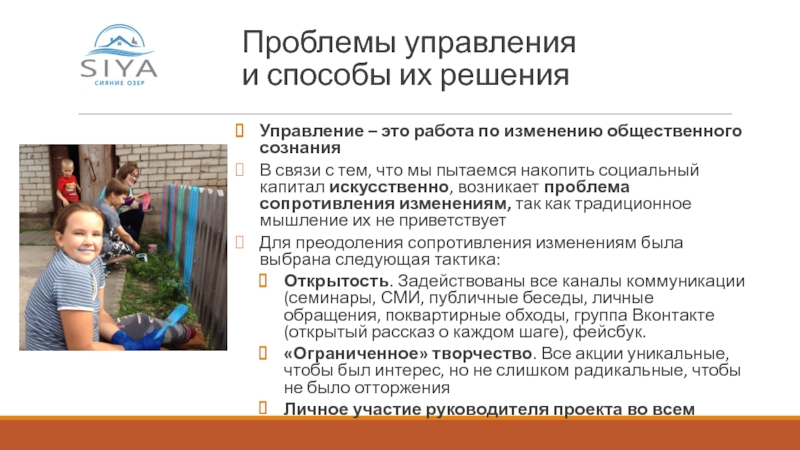 Открытость. Задействованы все каналы коммуникации (семинары, СМИ, публичные беседы, личные обращения, поквартирные обходы, группа Вконтакте (открытый рассказ о каждом шаге), фейсбук.