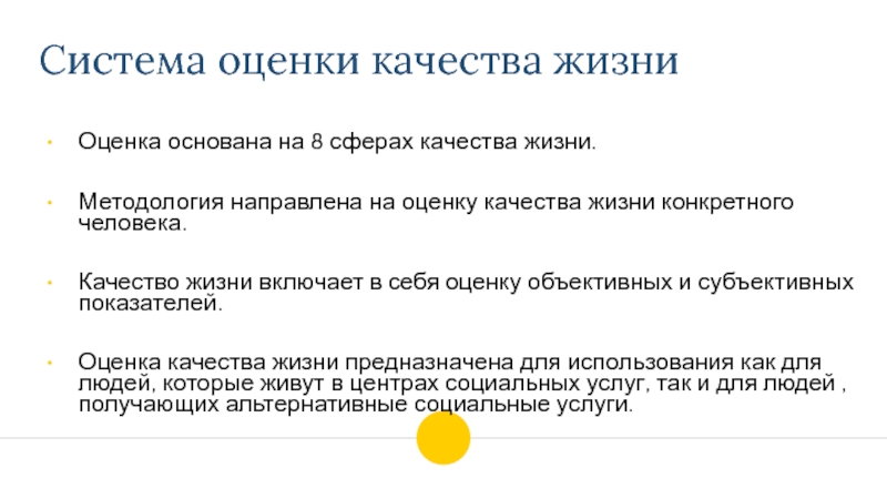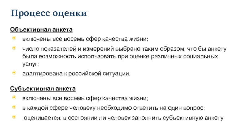 Оценка качества жизни предназначена для использования как для людей, которые живут в центрах социальных услуг, так и для людей , получающих альтернативные социальные услуги.
