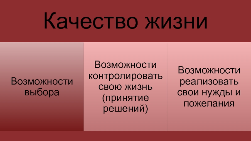 - Качество жизни обеспечено, если основные потребности человека удовлетворены, и человек имеет возможность реализовать свои желания и мечты;