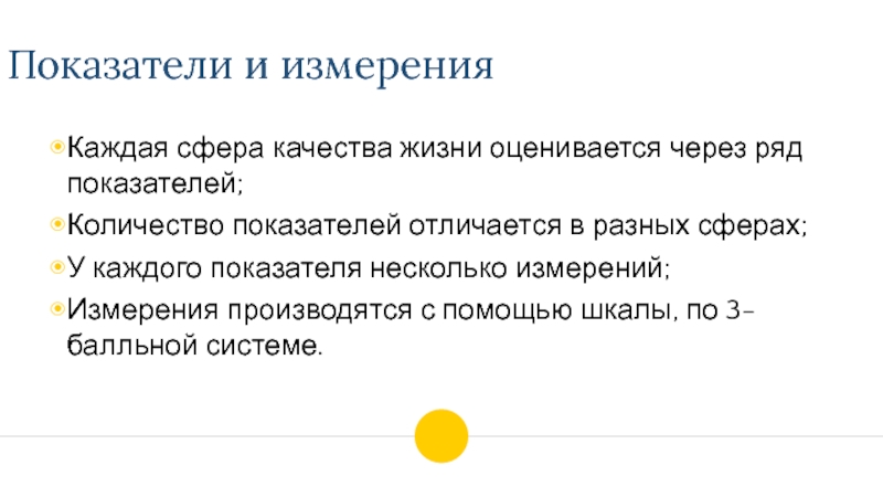 Каждая сфера качества жизни оценивается через ряд показателей;