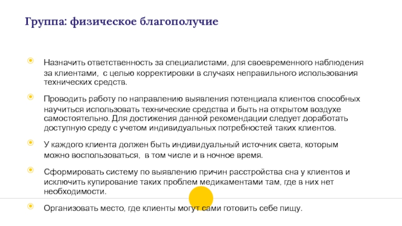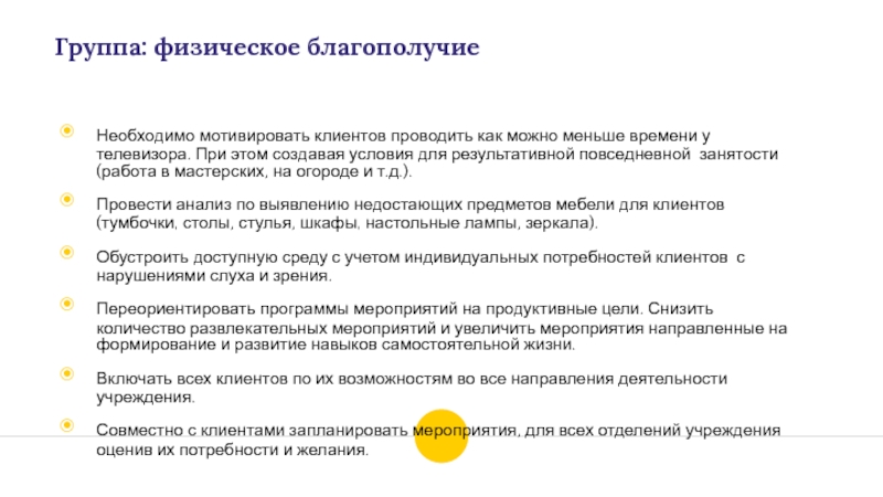 работу по направлению выявления потенциала клиентов способных научиться использовать технические средства и быть на открытом воздухе самостоятельно. Для достижения данной рекомендации следует доработать доступную среду с учетом индивидуальных потребностей таких клиентов.