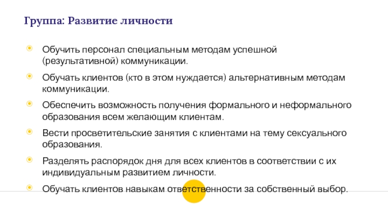 Разделять распорядок дня для всех клиентов в соответствии с их индивидуальным развитием личности.
