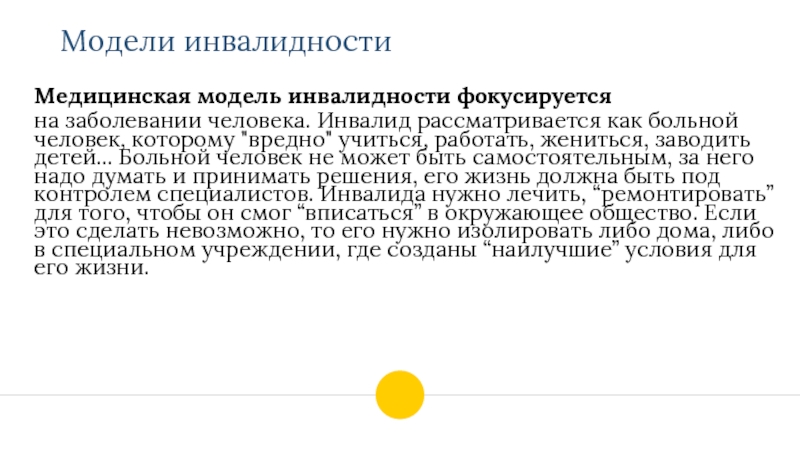 человек не может быть самостоятельным, за него надо думать и принимать решения, его жизнь должна быть под контролем специалистов. Инвалида нужно лечить, “ремонтировать” для того, чтобы он смог “вписаться” в окружающее общество. Если это сделать невозможно, то его нужно изолировать либо дома, либо в специальном учреждении, где созданы “наилучшие” условия для его жизни.