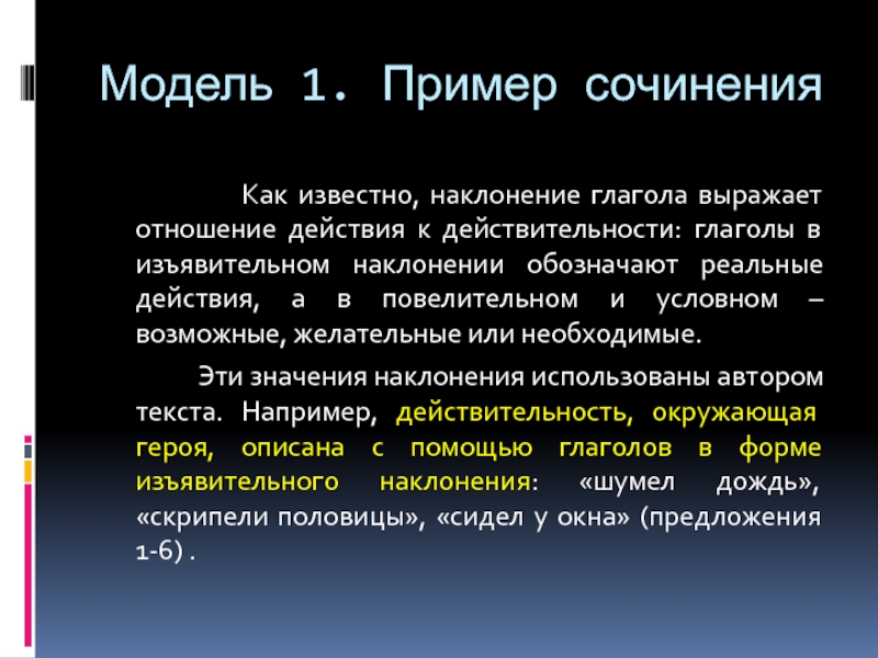 Эти значения наклонения использованы автором текста. Например, действительность, окружающая героя, описана с помощью глаголов в форме изъявительного наклонения: «шумел дождь», «скрипели половицы», «сидел у окна» (предложения 1-6) .