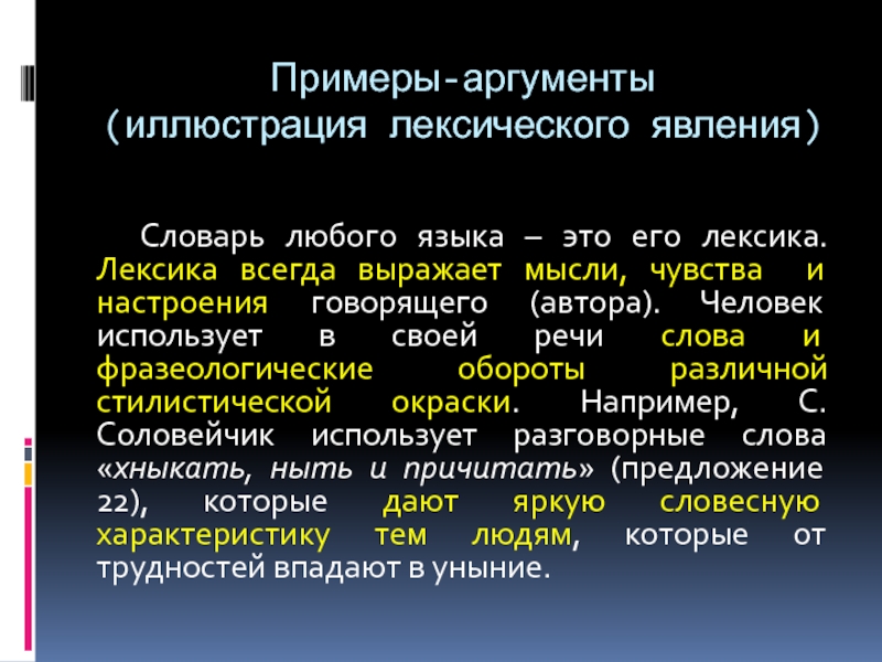 в своей речи слова и фразеологические обороты различной стилистической окраски. Например, С.Соловейчик использует разговорные слова «хныкать, ныть и причитать» (предложение 22), которые дают яркую словесную характеристику тем людям, которые от трудностей впадают в уныние.