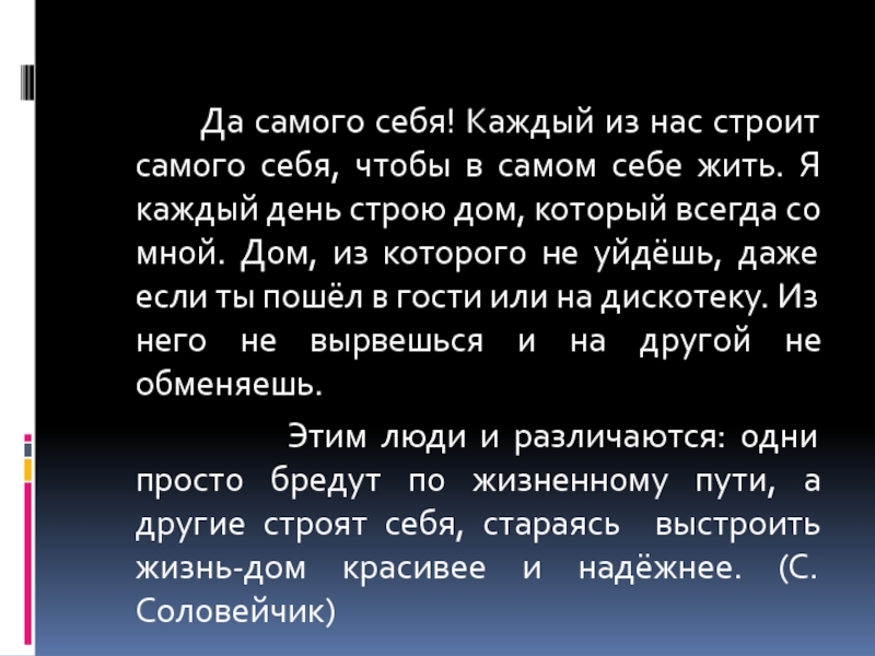 Этим люди и различаются: одни просто бредут по жизненному пути, а другие строят себя, стараясь выстроить жизнь-дом красивее и надёжнее. (С. Соловейчик)