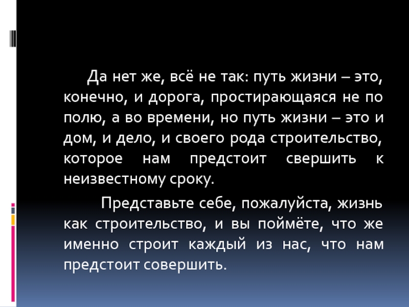 по полю, а во времени, но путь жизни – это и дом, и дело, и своего рода строительство, которое нам предстоит свершить к неизвестному сроку.