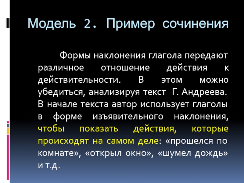 этом можно убедиться, анализируя текст Г. Андреева. В начале текста автор использует глаголы в форме изъявительного наклонения, чтобы показать действия, которые происходят на самом деле: «прошелся по комнате», «открыл окно», «шумел дождь» и т.д.