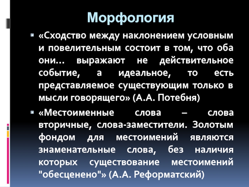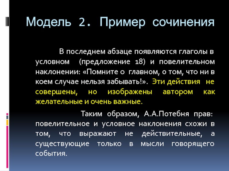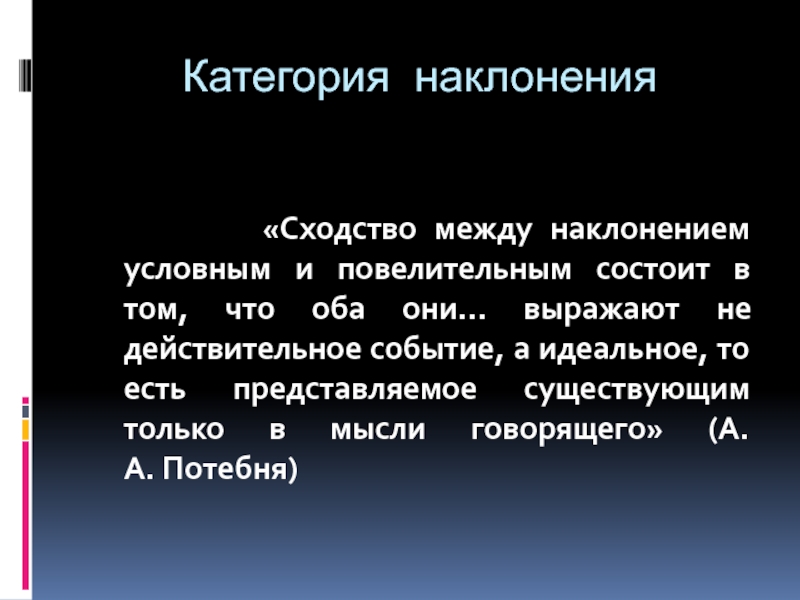 Таким образом, А.А.Потебня прав: повелительное и условное наклонения схожи в том, что выражают не действительные, а существующие только в мысли говорящего события.