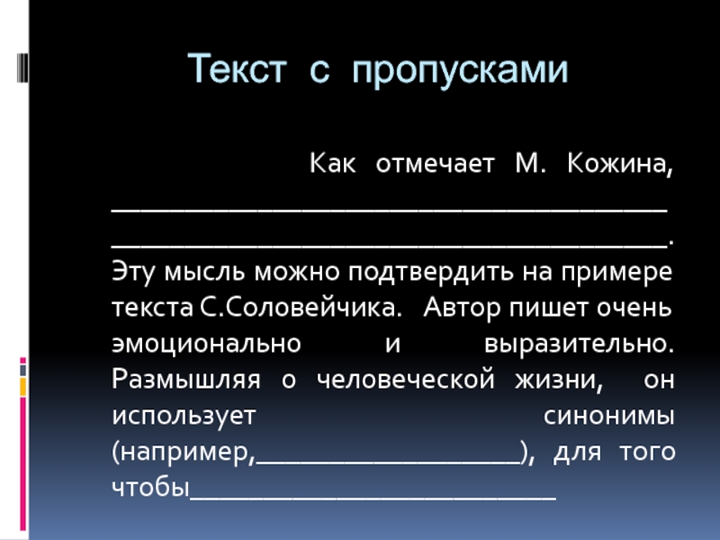 С.Соловейчика. Автор пишет очень эмоционально и выразительно. Размышляя о человеческой жизни, он использует синонимы (например,__________________), для того чтобы_________________________