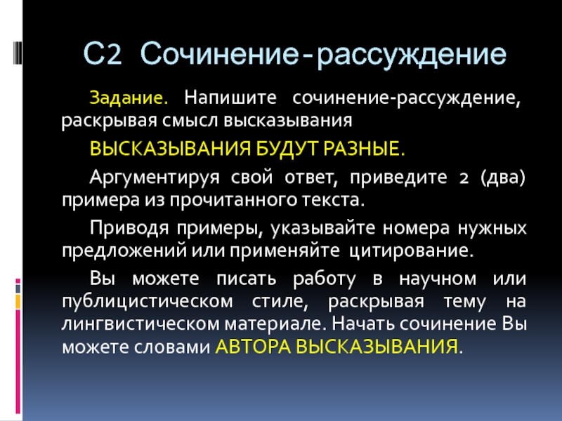 Вы можете писать работу в научном или публицистическом стиле, раскрывая тему на лингвистическом материале. Начать сочинение Вы можете словами АВТОРА ВЫСКАЗЫВАНИЯ.