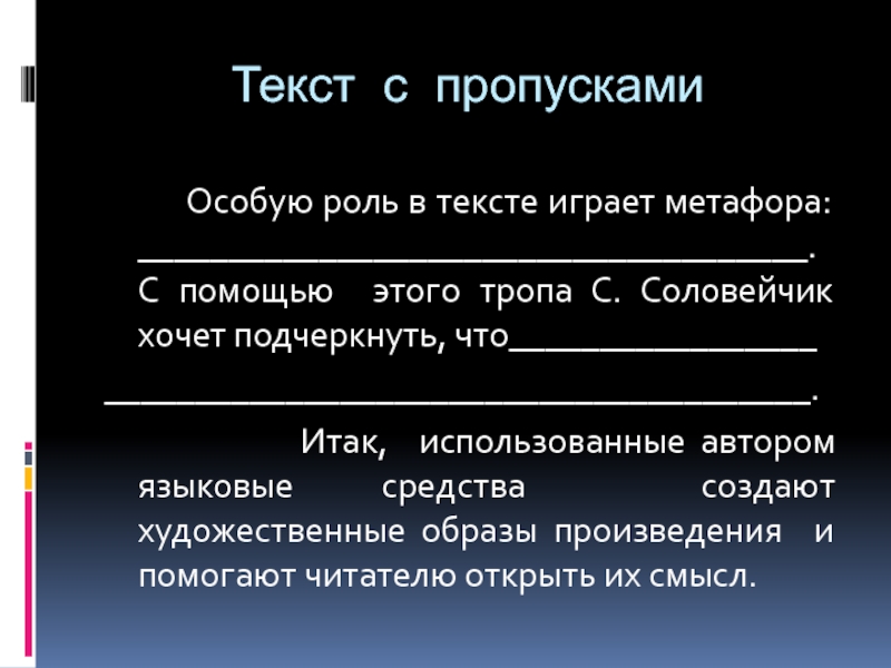 тексте играет метафора: _____________________________________. С помощью этого тропа С. Соловейчик