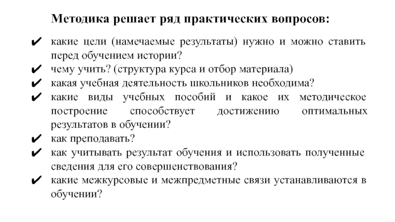 Методика решает ряд практических вопросов: какие цели (намечаемые результаты) нужно и можно ставить перед обучением истории?чему учить?