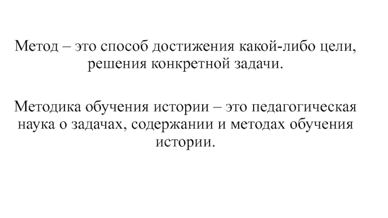 Метод – это способ достижения какой-либо цели, решения конкретной задачи.Методика обучения истории – это педагогическая наука о задачах, содержании и методах обучения истории.