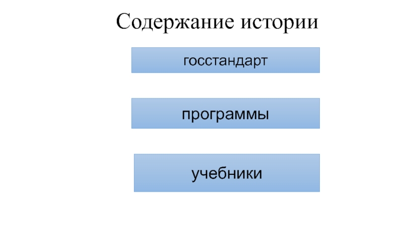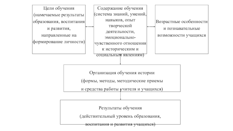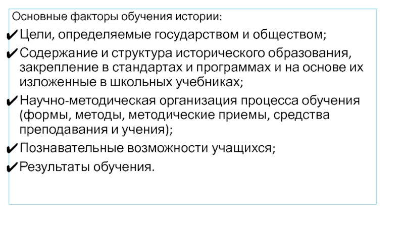 Основные факторы обучения истории:Цели, определяемые государством и обществом;Содержание и структура исторического образования, закрепление в стандартах и программах