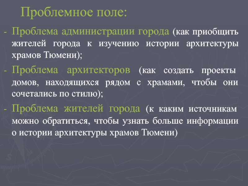 Проблемное поле:Проблема администрации города (как приобщить жителей города к изучению истории архитектуры храмов Тюмени);Проблема архитекторов (как создать