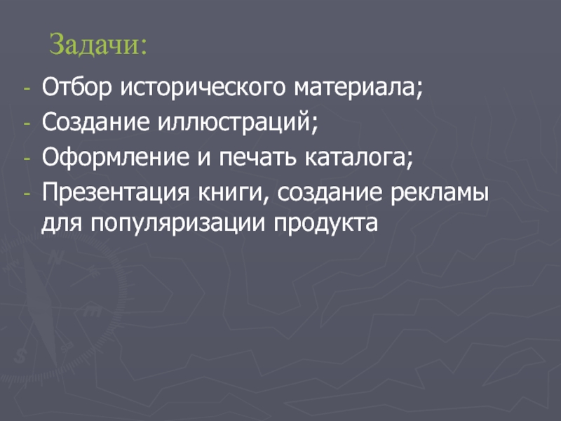 Задачи: Отбор исторического материала;Создание иллюстраций;Оформление и печать каталога;Презентация книги, создание рекламы для популяризации продукта