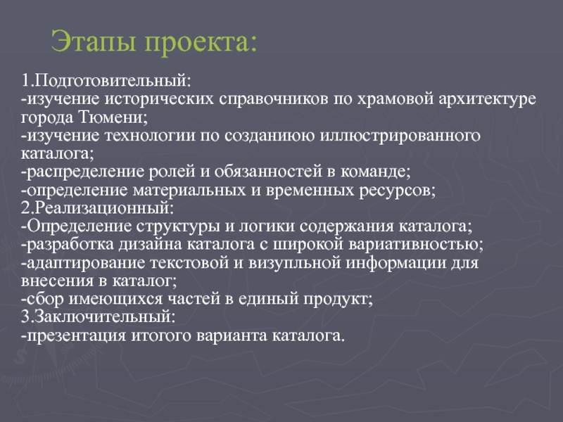 Этапы проекта:1.Подготовительный: -изучение исторических справочников по храмовой архитектуре города Тюмени; -изучение технологии по созданиюю иллюстрированного каталога; -распределение