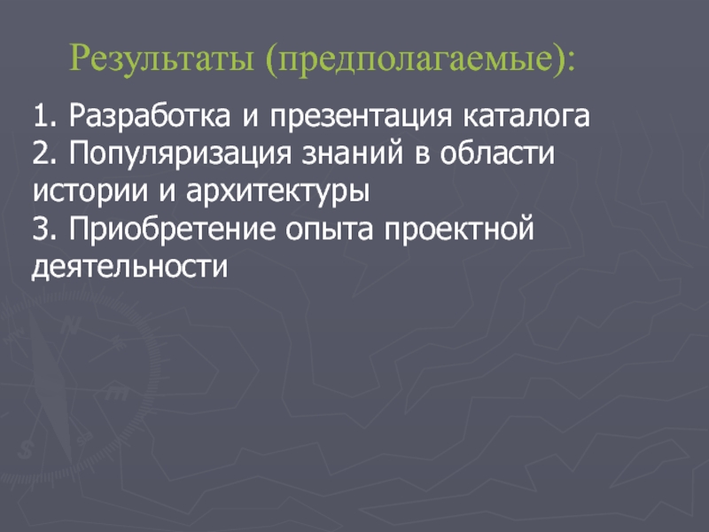 Результаты (предполагаемые):1. Разработка и презентация каталога  2. Популяризация знаний в области истории и архитектуры  3. Приобретение опыта