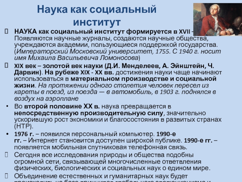 XIX век – золотой век науки (Д.И. Менделеев, А. Эйнштейн, Ч. Дарвин). На рубеже XIX - XX вв. достижения науки чаще начинают использоваться в материальном производстве и социальной жизни. На протяжении одного столетия человек пересел из кареты в поезд, из поезда — в автомобиль, в 1903 г. поднялся в воздух на аэроплане