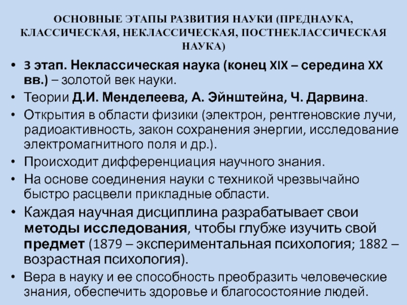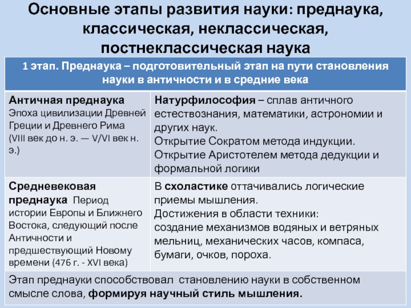 ОСНОВНЫЕ ЭТАПЫ РАЗВИТИЯ НАУКИ (ПРЕДНАУКА, КЛАССИЧЕСКАЯ, НЕКЛАССИЧЕСКАЯ, ПОСТНЕКЛАССИЧЕСКАЯ НАУКА)