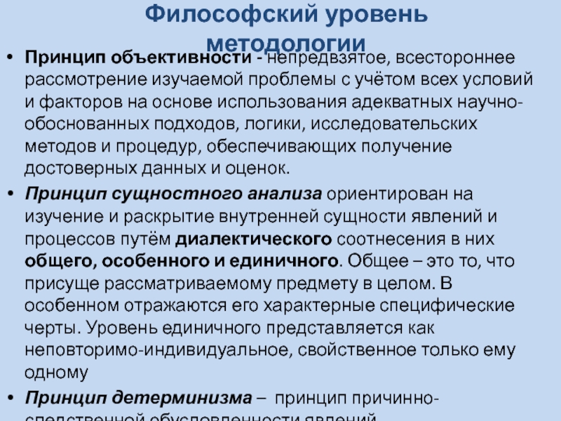 и общества; о целях и смыслах жизни и деятельности человека. ПРИНЦИПЫ объективности и сущностного анализа.