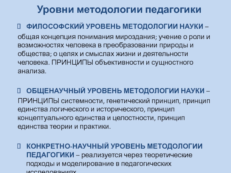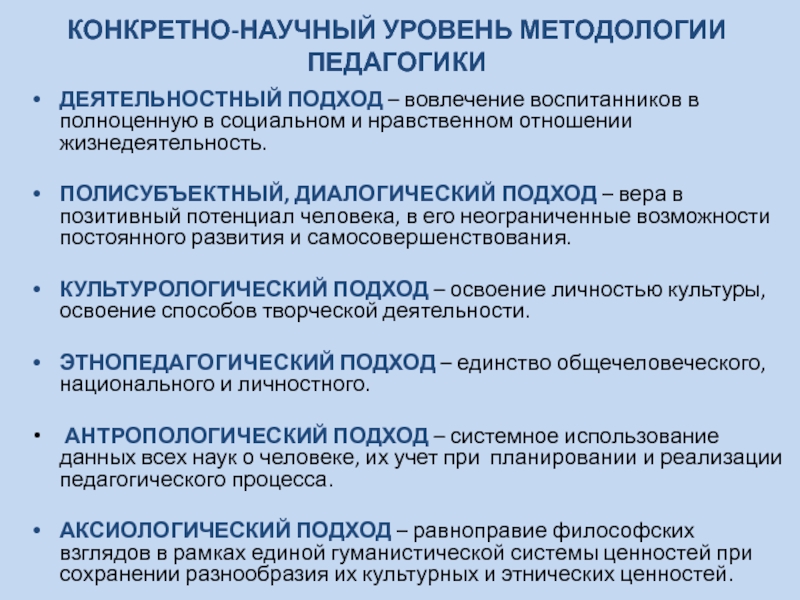 КОНКРЕТНО-НАУЧНЫЙ УРОВЕНЬ МЕТОДОЛОГИИ ПЕДАГОГИКИ – реализуется через теоретические подходы и моделирование в педагогических исследованиях.
