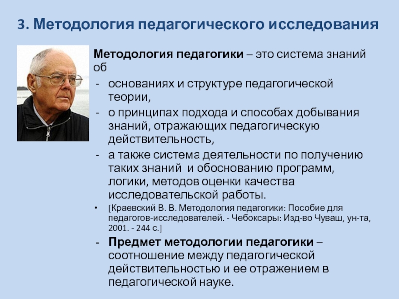 [Краевский В. В. Методология педагогики: Пособие для педагогов-исследователей. - Чебоксары: Изд-во Чуваш, ун-та, 2001. - 244 с.]