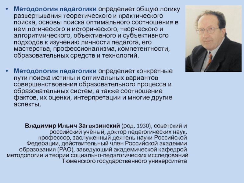 Владимир Ильич Загвязинский (род. 1930), советский и российский учёный, доктор педагогических наук, профессор, заслуженный деятель науки Российской Федерации, действительный член Российской академии образования (РАО), заведующий академической кафедрой методологии и теории социально-педагогических исследований Тюменского государственного университета
