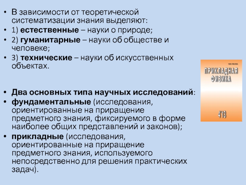фундаментальные (исследования, ориентированные на приращение предметного знания, фиксируемого в форме наиболее общих представлений и законов);