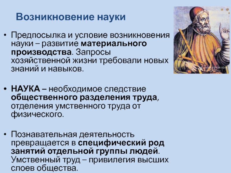 Предпосылка и условие возникновения науки – развитие материального производства.