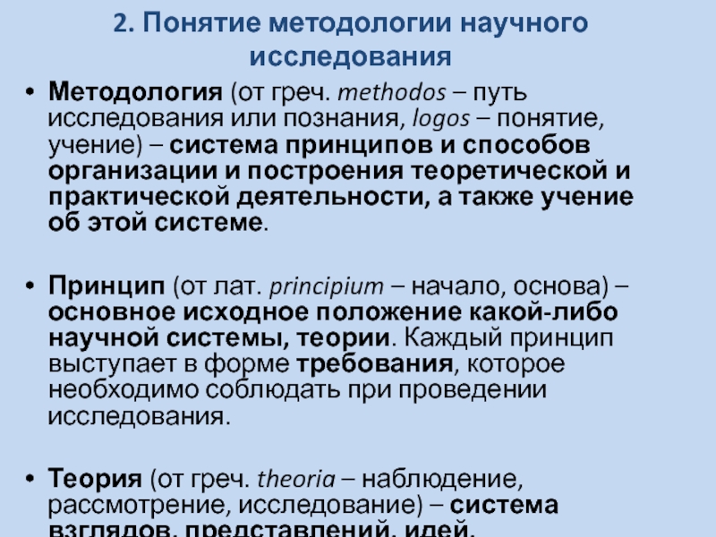 Принцип (от лат. principium – начало, основа) – основное исходное положение какой-либо научной системы, теории. Каждый принцип выступает в форме требования, которое необходимо соблюдать при проведении исследования.