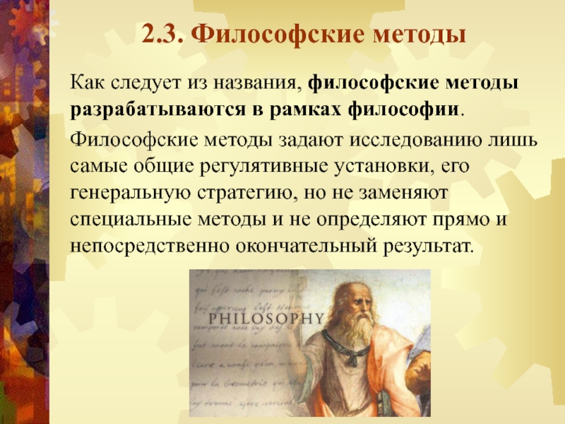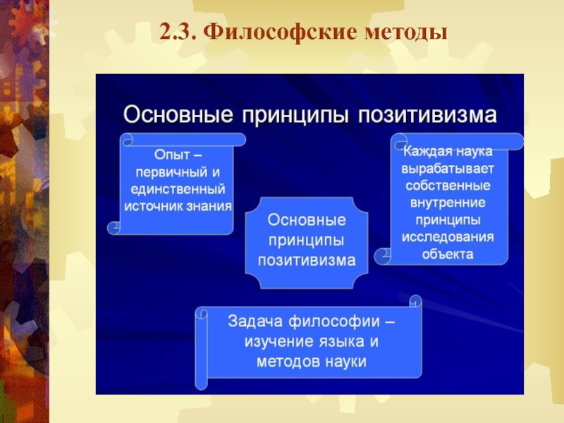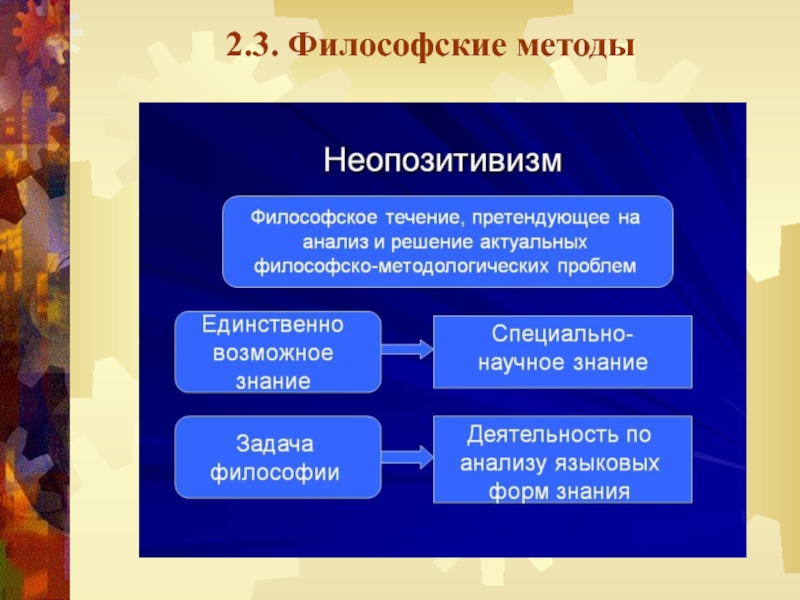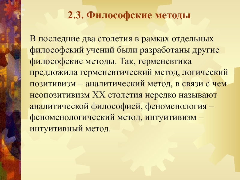 метод, логический позитивизм – аналитический метод, в связи с чем неопозитивизм ХХ столетия нередко называют аналитической философией, феноменология – феноменологический метод, интуитивизм – интуитивный метод.