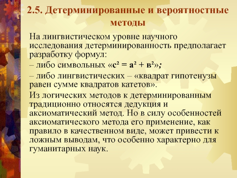 Из логических методов к детерминированным традиционно относятся дедукция и аксиоматический метод. Но в силу особенностей аксиоматического метода его применение, как правило в качественном виде, может привести к ложным выводам, что особенно характерно для гуманитарных наук.