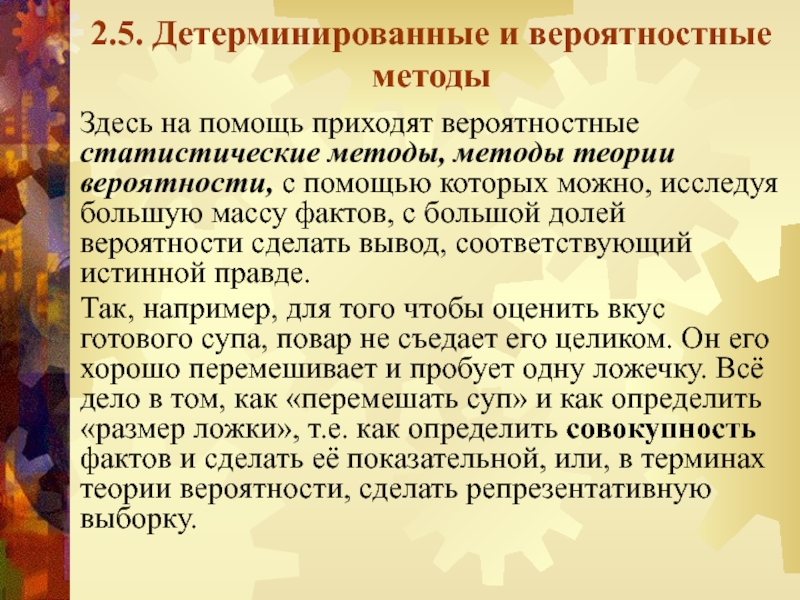 Так, например, для того чтобы оценить вкус готового супа, повар не съедает его целиком. Он его хорошо перемешивает и пробует одну ложечку. Всё дело в том, как «перемешать суп» и как определить «размер ложки», т.е. как определить совокупность фактов и сделать её показательной, или, в терминах теории вероятности, сделать репрезентативную выборку.