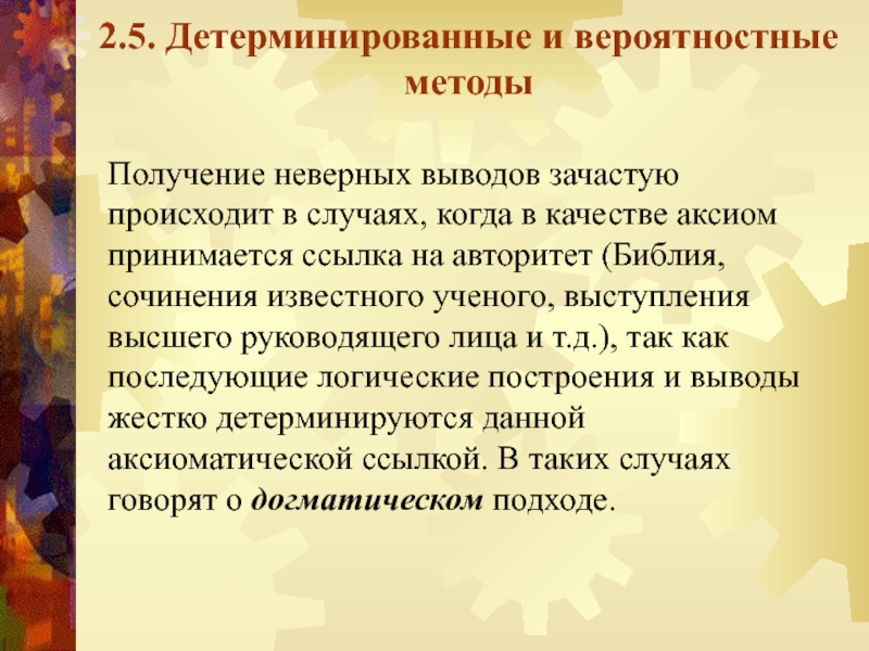 сочинения известного ученого, выступления высшего руководящего лица и т.д.), так как последующие логические построения и выводы жестко детерминируются данной аксиоматической ссылкой. В таких случаях говорят о догматическом подходе.