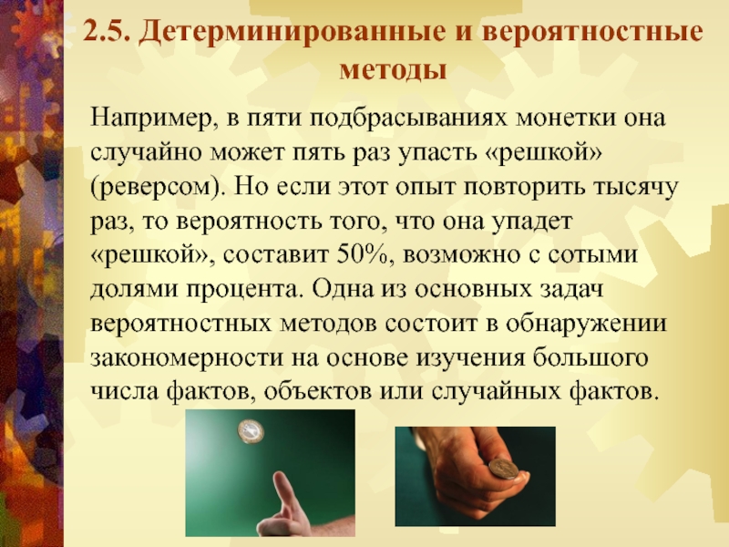 опыт повторить тысячу раз, то вероятность того, что она упадет «решкой», составит 50%, возможно с сотыми долями процента. Одна из основных задач вероятностных методов состоит в обнаружении закономерности на основе изучения большого числа фактов, объектов или случайных фактов.