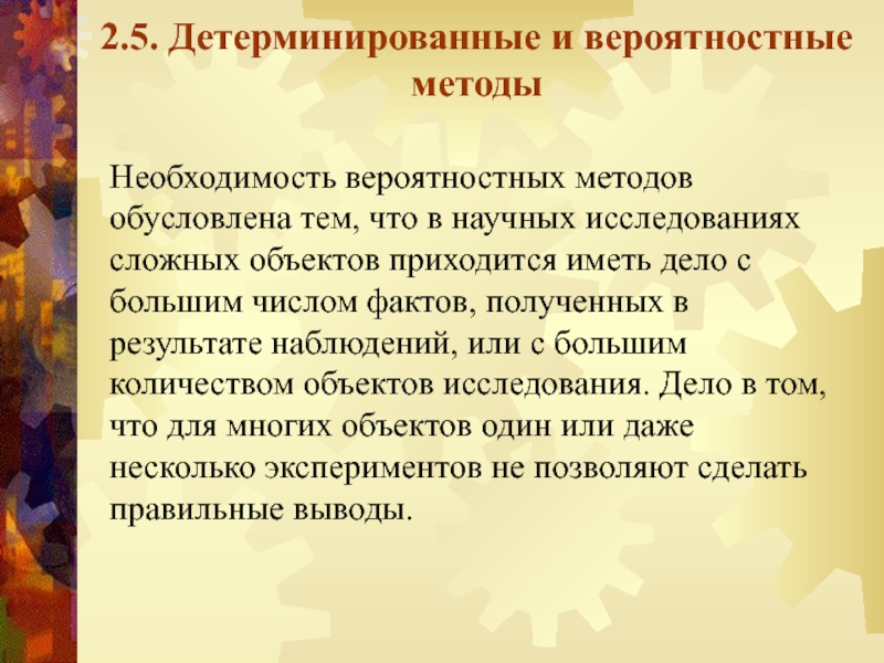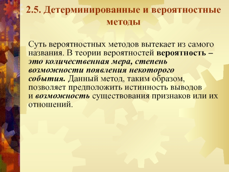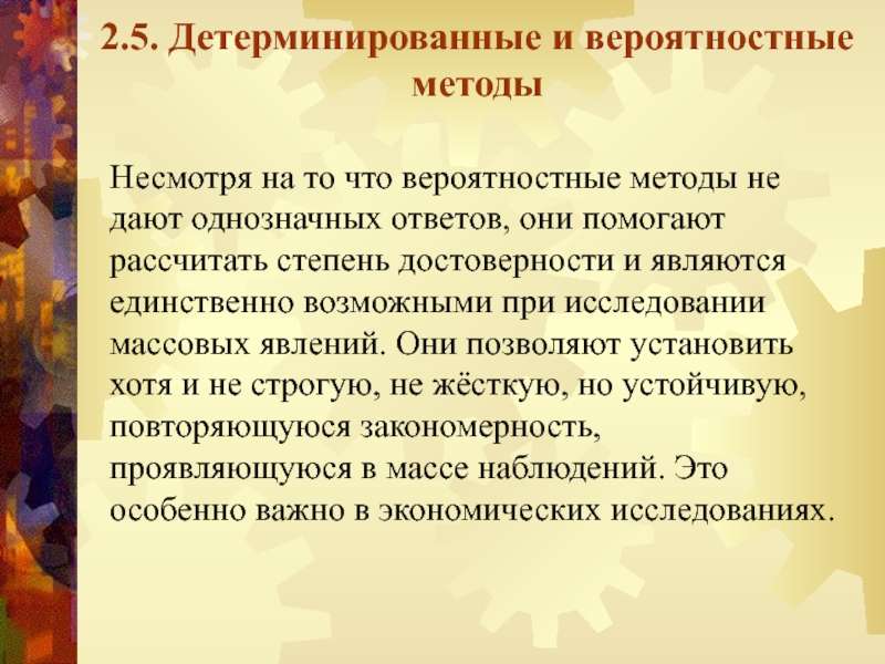 лат. determinare – определять), поэтому исследование приводит к однозначным выводам. Причем именно жёсткость, безаппеляционность отношений и выводов является отличительной чертой детерминированных методов.