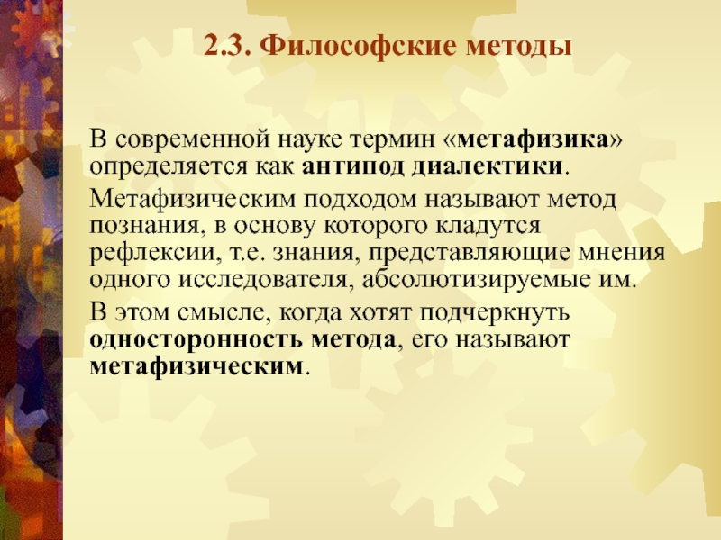 В этом смысле, когда хотят подчеркнуть односторонность метода, его называют метафизическим.