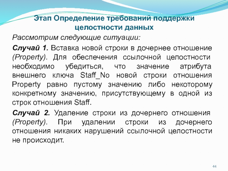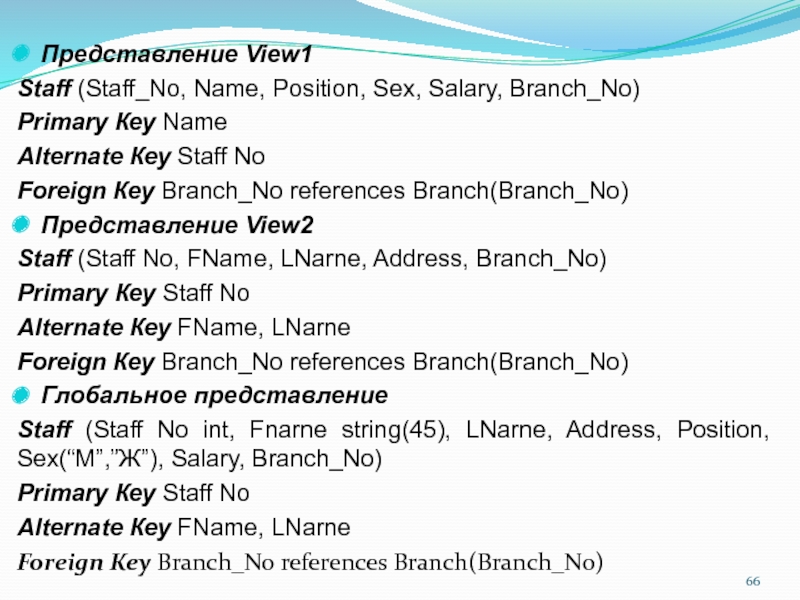 Staff (Staff No int, Fnarne string(45), LNarne, Address, Position, Sex(“М”,”Ж”), Salary, Branch_No)