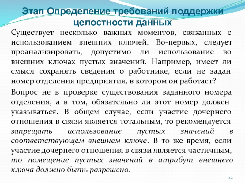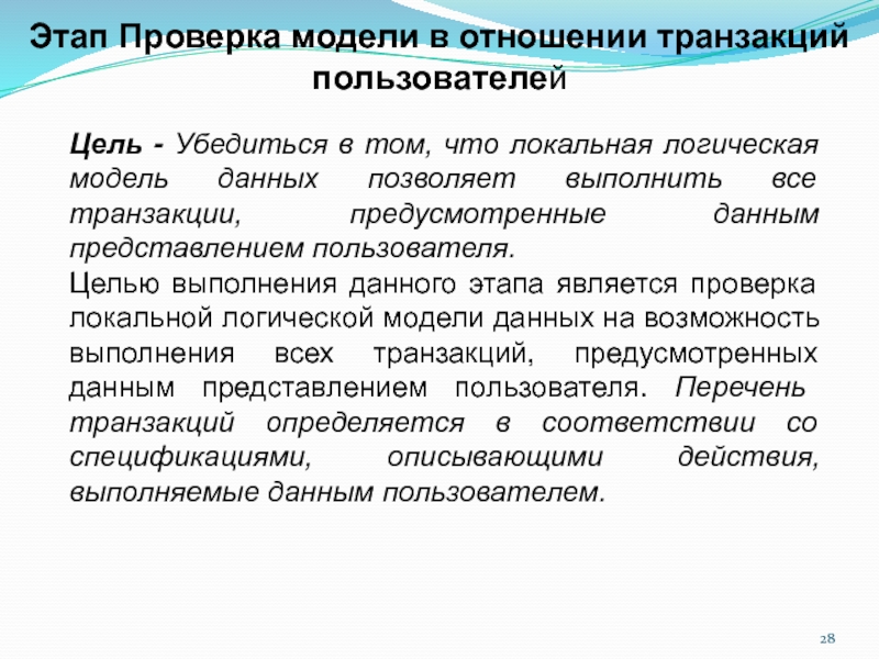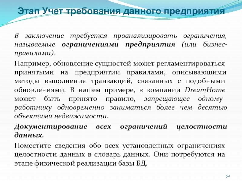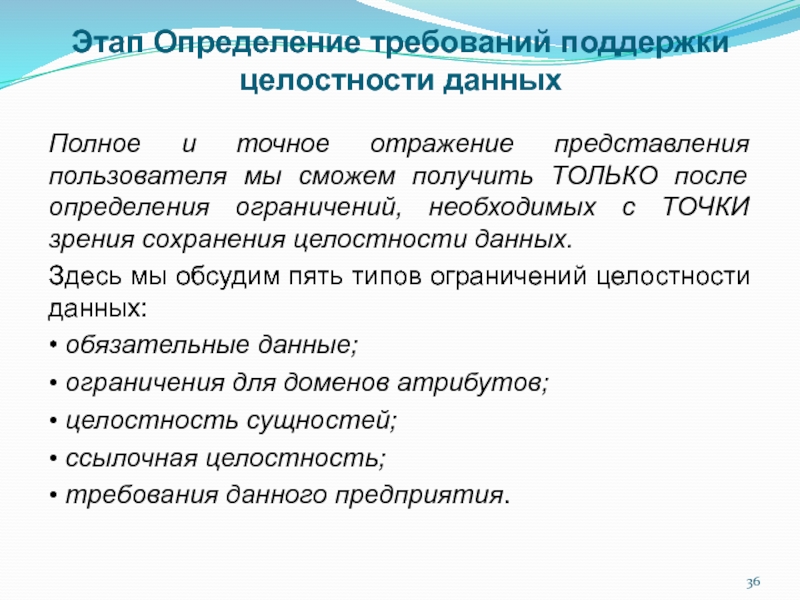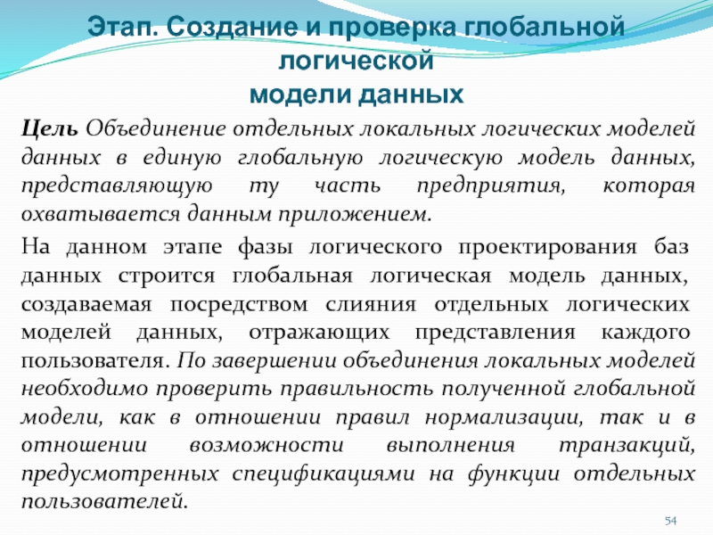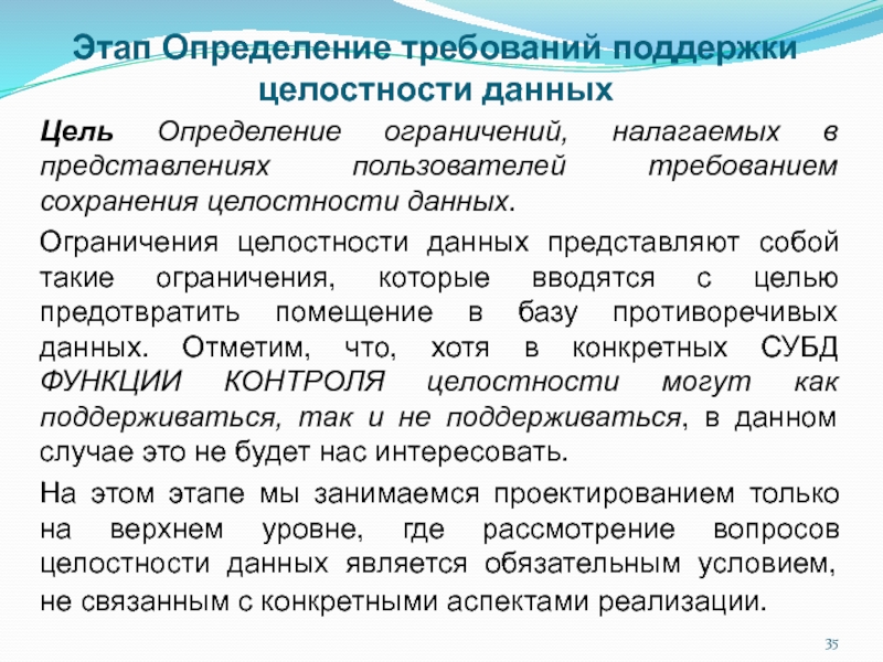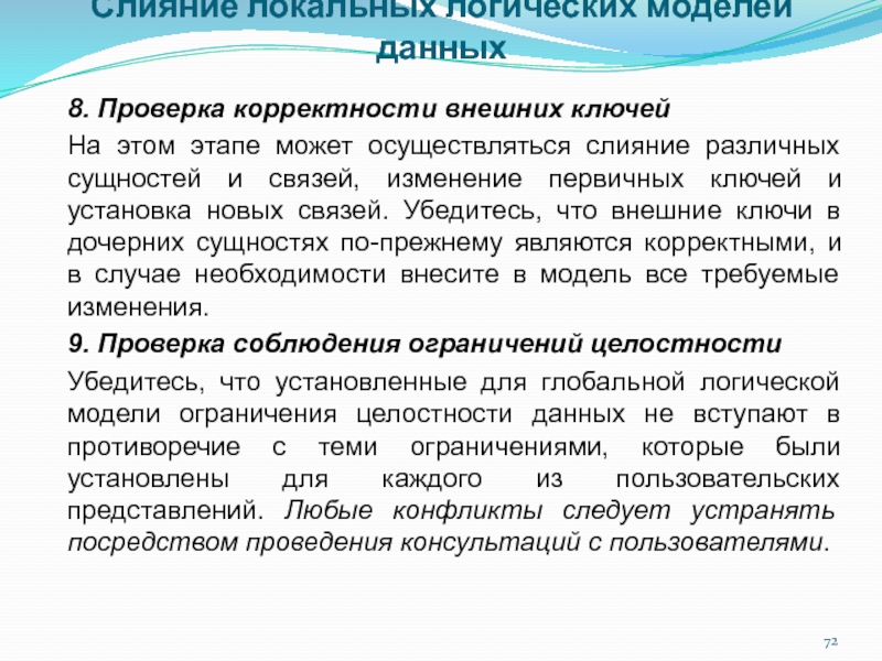 Убедитесь, что установленные для глобальной логической модели ограничения целостности данных не вступают в противоречие с теми ограничениями, которые были установлены для каждого из пользовательских представлений. Любые конфликты следует устранять посредством проведения консультаций с пользователями.