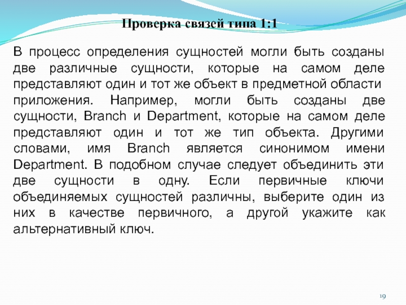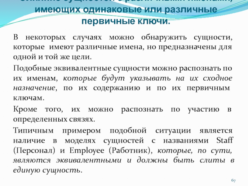 Типичным примером подобной ситуации является наличие в моделях сущностей с названиями Staff (Персонал) и Employee (Работник), которые, по сути, являются эквивалентными и должны быть слиты в единую сущность.