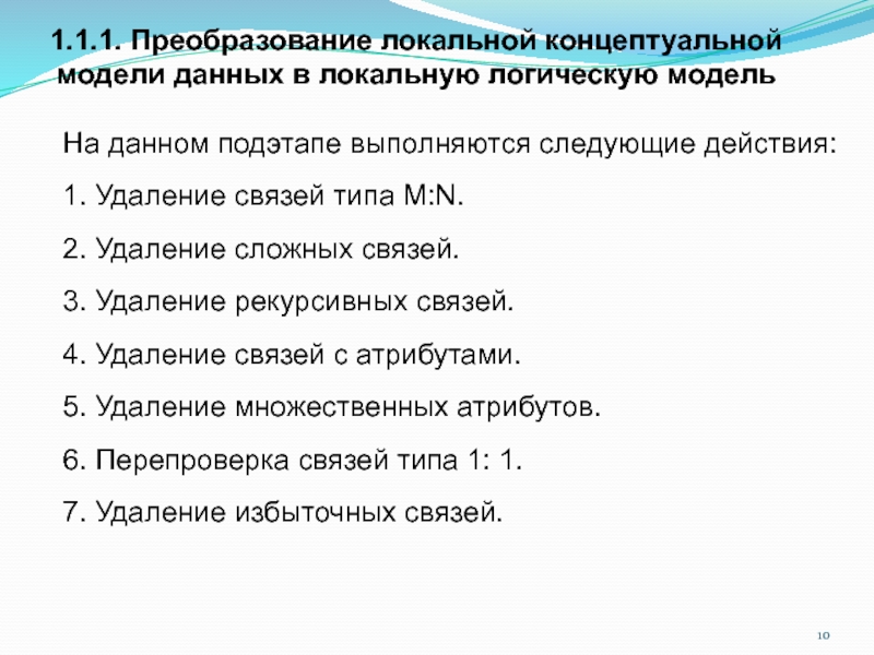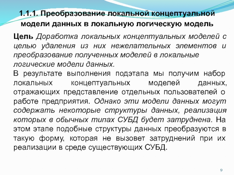 Слайд 91.1.1. Преобразование локальной концептуальной модели данных в локальную логическую модель