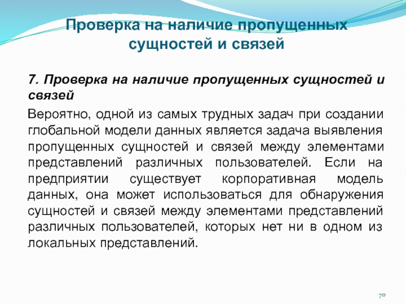Слайд 70Проверка на наличие пропущенных сущностей и связей